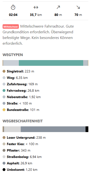- Überwiegend asphaltierte Fahrrad- und Feldwege (nur 200m auf Land- und Bundestrassen)